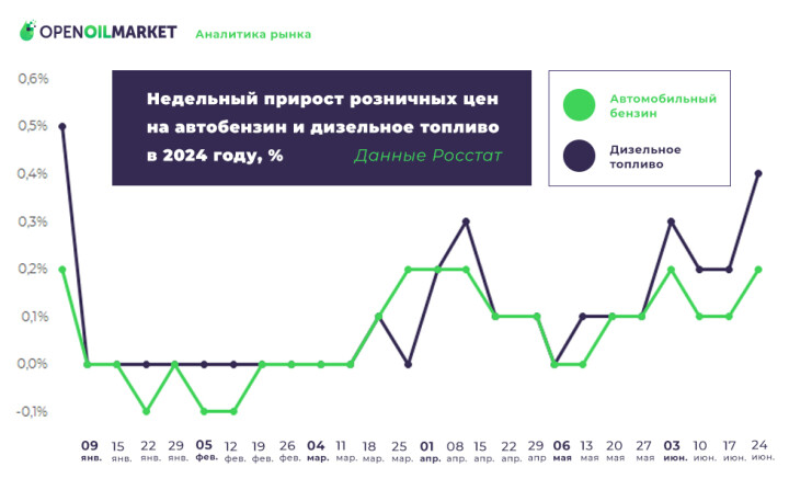 Сейчас на розничном рынке наблюдается активный рост цен на дизельное топливо и бензин. Если зимой цены практически не менялись, а весной увеличение составляло в среднем 0,1% в неделю, то в конце июня дизельное топливо выросло на 0,4%, а бензин - на 0,2% за одну неделю (17-24 июня).