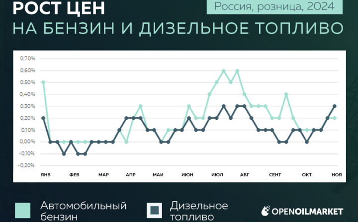 Росстат зафиксировал очередное ускорение топливных цен: на неделе с 22 по 28 октября 2024 г. цена на бензин выросли на 0,2%, а на дизельное топливо – и вовсе на 0,3%.